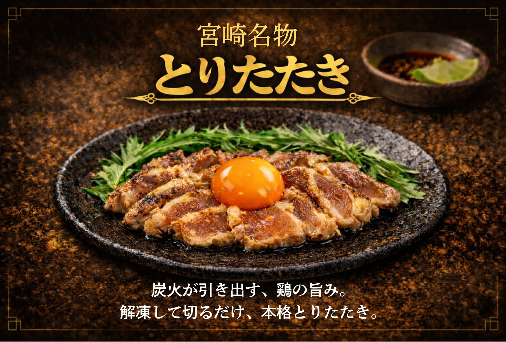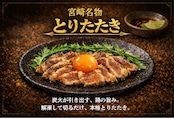 宮崎県を代表する郷土料理、とりたたき。炭火で炙った親鳥の胸肉を、秘伝のたれで味付け。新鮮で安全な環境で調理しているからこそ、安心してお召し上がりいただけます。一口食べるたびに贅沢な味わいを感じていただけることでしょう。旨味たっぷりのとりたたきは、お酒やごはんのお供に最適です。贅沢なひとときを演出する一品!!